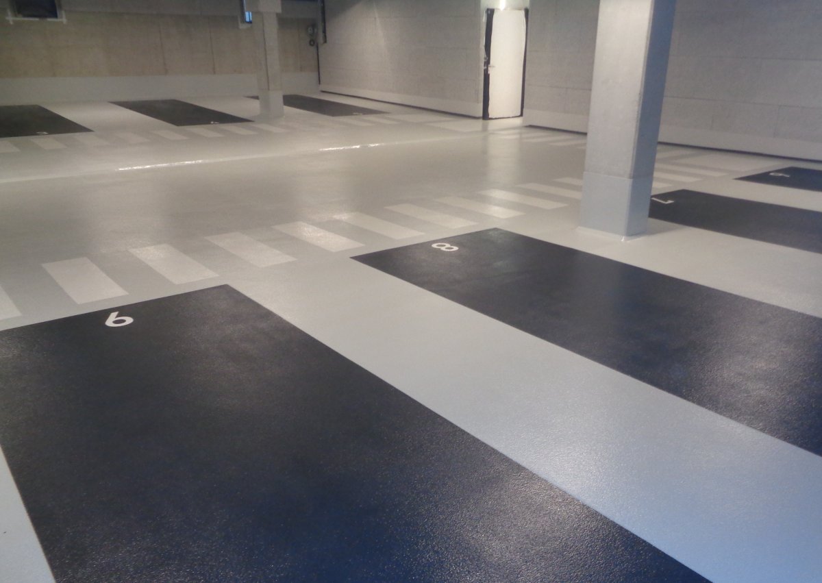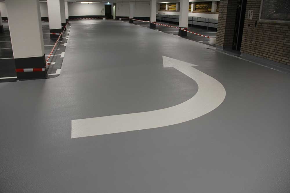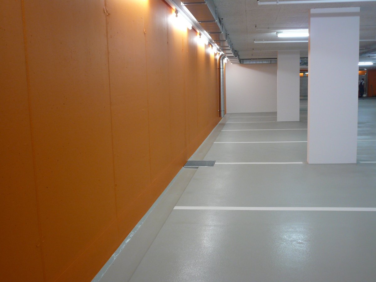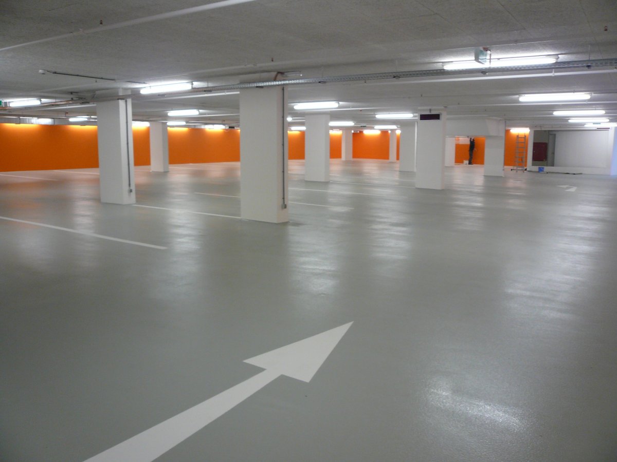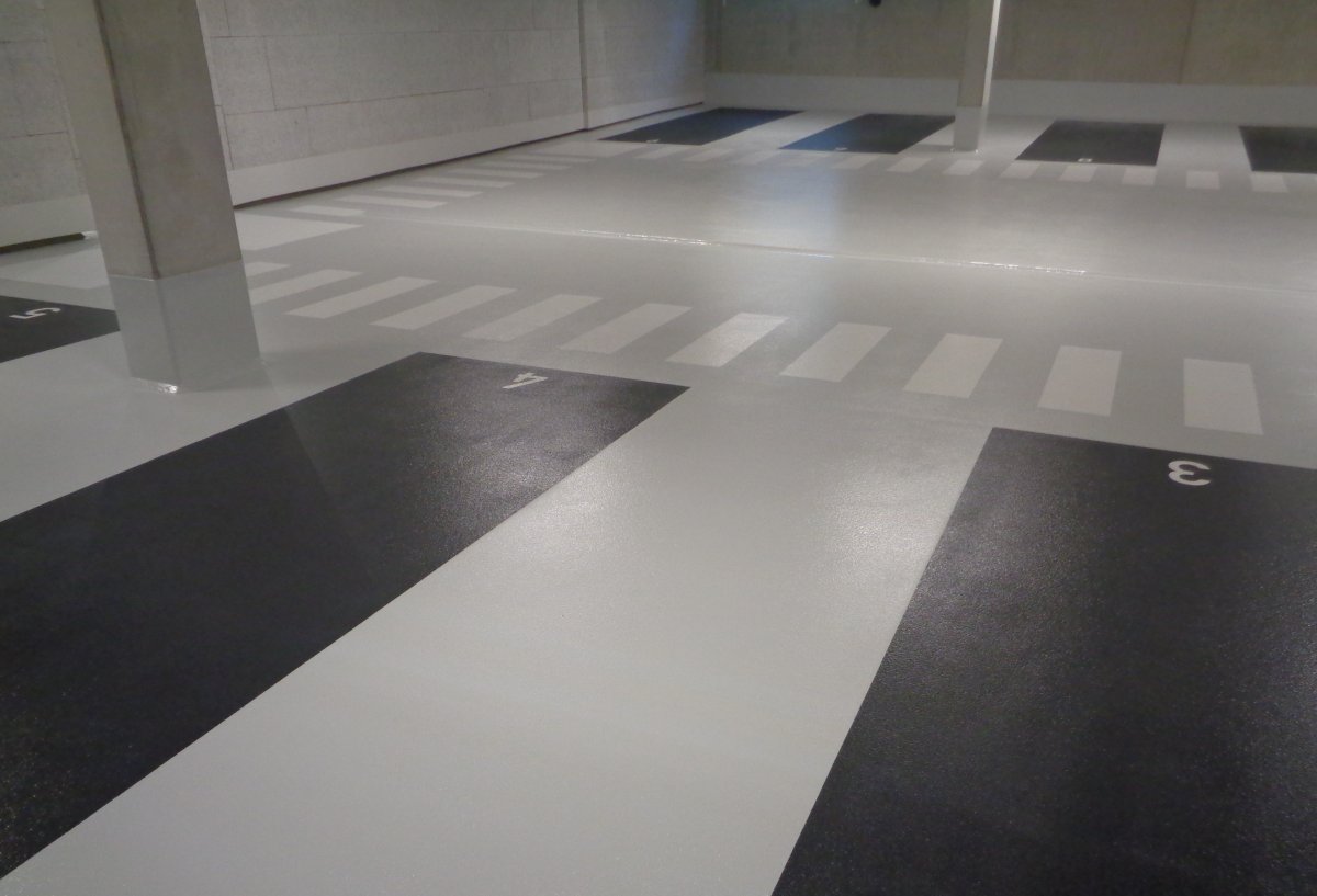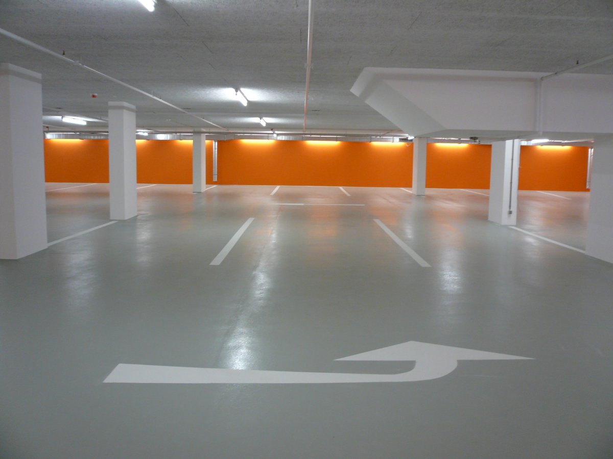 Die optionale Deckversiegelung bietet ein breites Farbspektrum. Damit lassen sich Parkhäuser und Tiefgaragen deutlich heller und freundlicher gestalten. Und auch die optisch eindeutige Kennzeichnung von Fahr-, Park- und Gehzonen ist kein Problem.